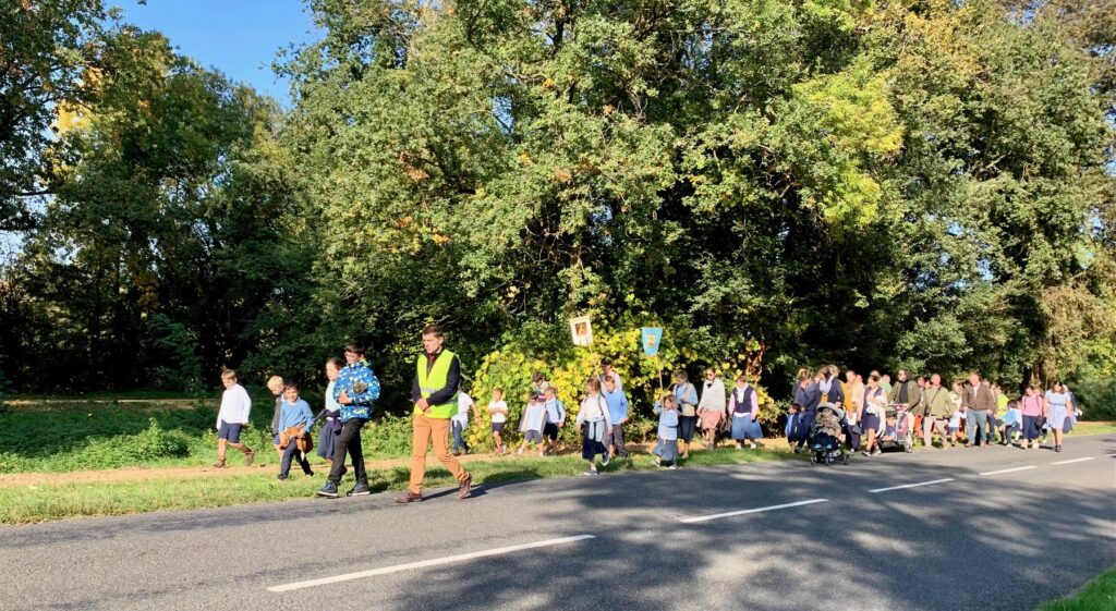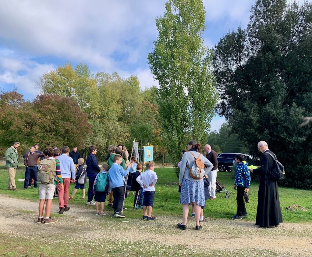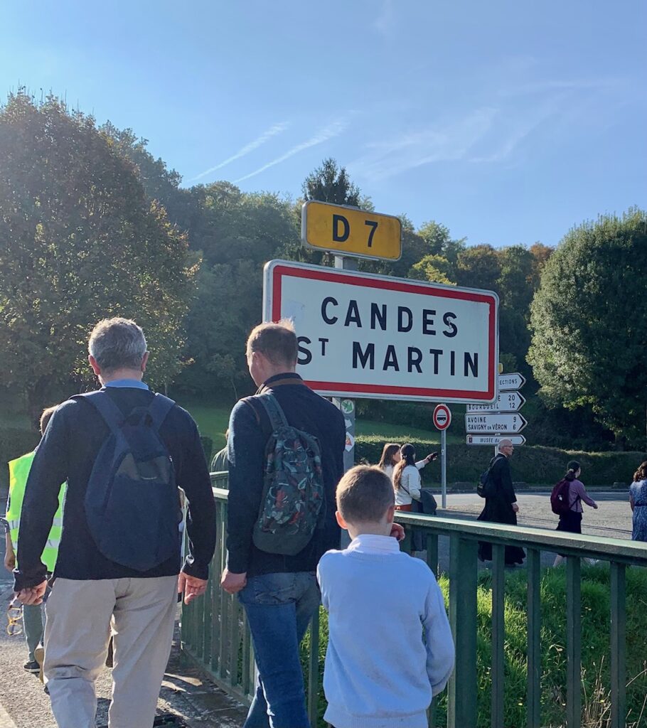 La seconde partie de la journée se déroulait à une cinquantaine de kilomètres de Tours, à la confluence de la Vienne et de la Loire, à Candes-Saint-Martin. C’est donc en voitures que nous avons quitté Tours, pour nous retrouver ensuite et former notre petit chapitre, sous le soleil enfin apparu. Quelques consignes du Père, et nous voilà sur la route, en véritables pèlerins que nous sommes !